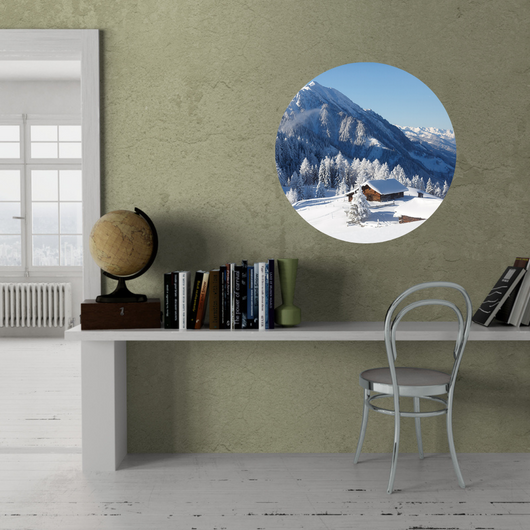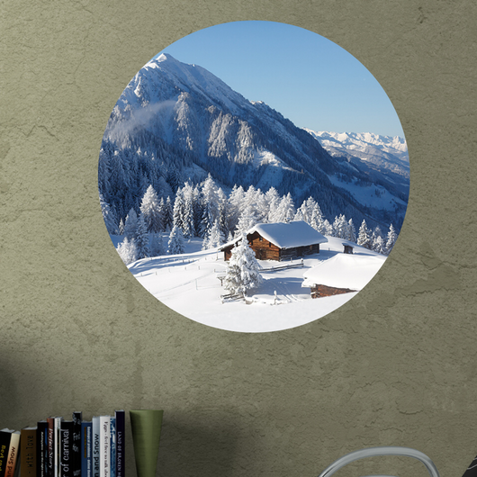 Ervaar de magie van Alpenbetovering elke dag opnieuw met onze unieke muurcirkel. Dit design toont een idyllische berghut, perfect geplaatst in het midden van een ongerept, besneeuwd landschap. Terwijl de majestueuze bevroren bergtoppen op de achtergrond een waakzaam oog houden, straalt de traditionele hut een gezellige warmte uit te midden van de winterse frisheid.