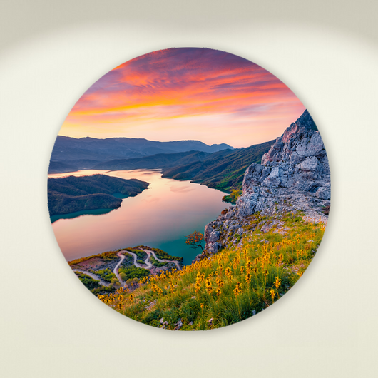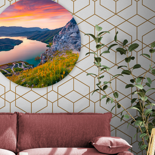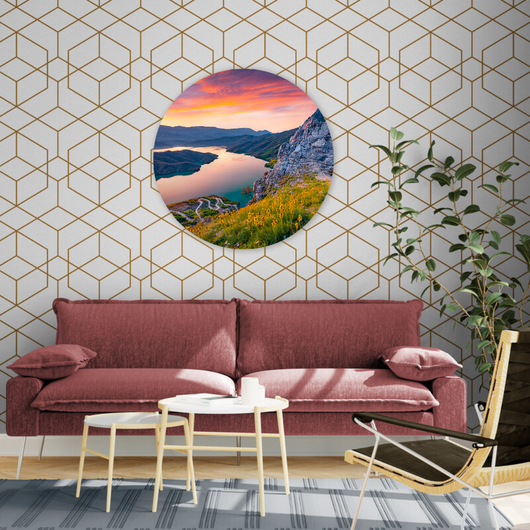 De warme tinten vermengd met het delicate licht voegen een rustgevende ambiance toe aan je ruimte. Laat je dagelijks omarmen door de natuurlijke pracht en start elke ochtend met hernieuwde energie. De Bergen bij Dageraad muurcirkel is een ode aan de belofte van een nieuwe dag.