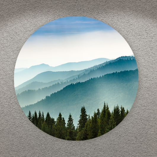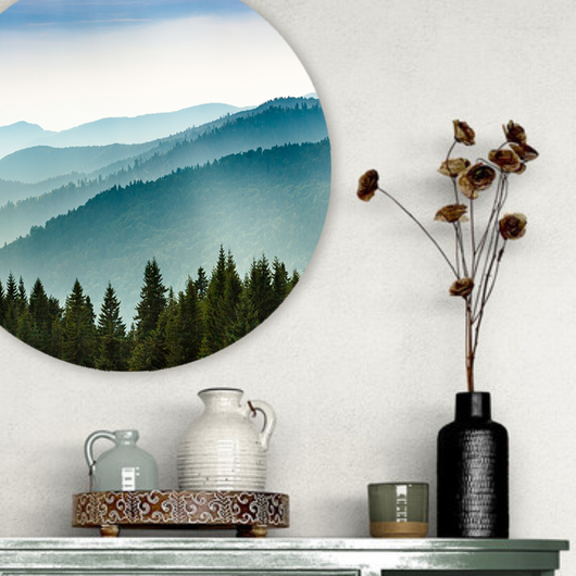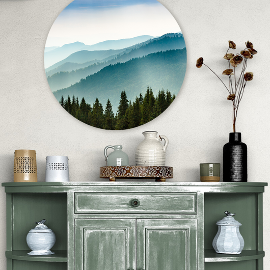 Ontdek de serene charme van zomerse hooglanden met onze muurcirkel Bergen in Ochtendnevel. Dit unieke stuk legt een moment vast waarop de eerste zonnestralen door de mistige bergbossen breken, een schouwspel dat zowel rustgevend als betoverend is.