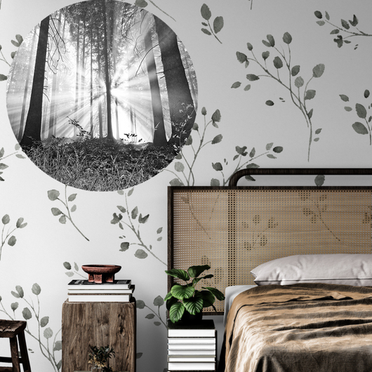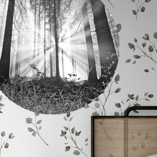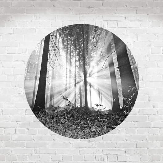 Betreed een wereld van rust met onze muurcirkel Bosmagie bij Dageraad. Dit prachtige beeld van een bos badend in het zachte licht van de ochtendzon benadrukt een uniek en modern tintje toe aan elke ruimte.