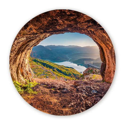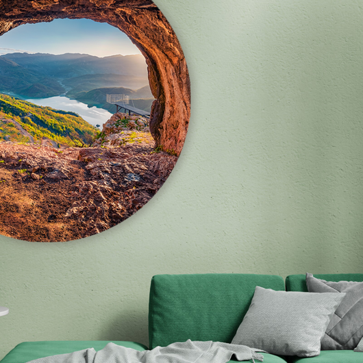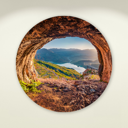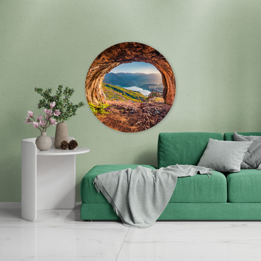 Creëer een rustpunt in je huis met de Grotuitzicht op Bovilla Meer muurcirkel. Deze ronde blikvanger neemt je mee naar een serene plek in Albanië, waar het kristalheldere water en de robuuste grotwanden een verhaal van tijdloze natuur vertellen.