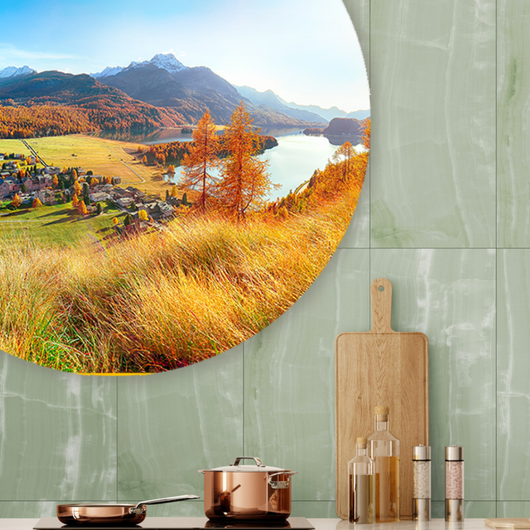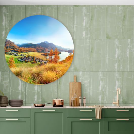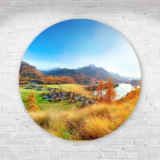 Breng de rijke kleuren van de herfst in je interieur met onze Herfstharmonie aan het Meer muurcirkel. De cirkelvormige uitsnede omarmt een betoverend panorama, waarin het warme herfstlicht de wereld in een gloed van amber en goud hult. Het levendige landschap, met zijn reflecterende water en pittoreske dorpje, wordt prachtig ingekaderd door deze unieke vorm, waardoor het een oogstrelende blikvanger is.