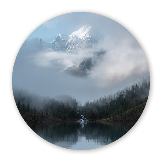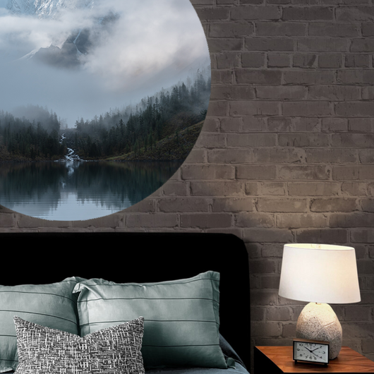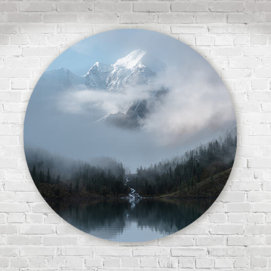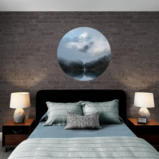 Voeg een element van serene pracht toe aan je leefruimte met onze Mistige Bergtoppen muurcirkel. Deze ronde blikvanger brengt de verstilde schoonheid van een winters berglandschap in je huis. De subtiele kleuren en de zachte overgangen tussen de mistige bergtoppen en het rustgevende meer creëren een beeld dat rust en bezinning uitstraalt. Een klein beekje dat door bosrijke heuvels kronkelt, complementeert dit vredige tafereel, en nodigt uit tot een moment van rust in onze hectische wereld.
