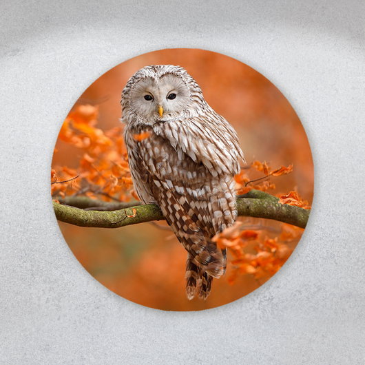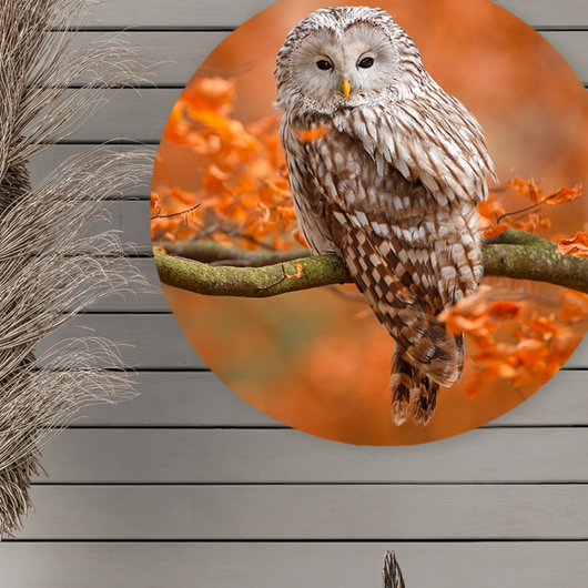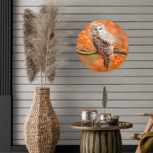 Ontdek de magische harmonie van de herfst en het dierenrijk met onze muurcirkel Mystieke Uil. Deze prachtige afbeelding toont een Oeral Uil zittend op een boomtak omringt door de warme oranje tinten van herfstbladeren.