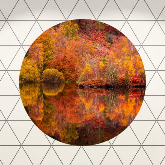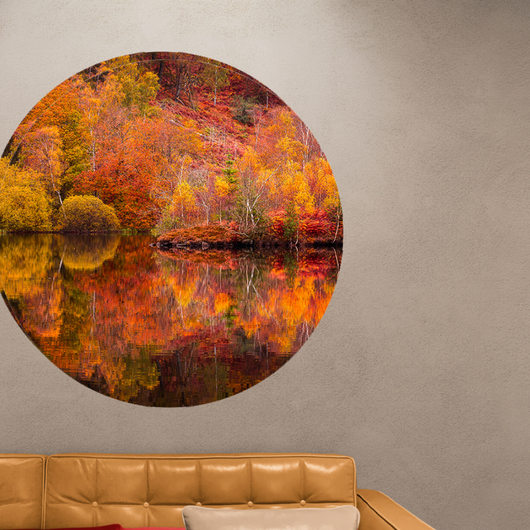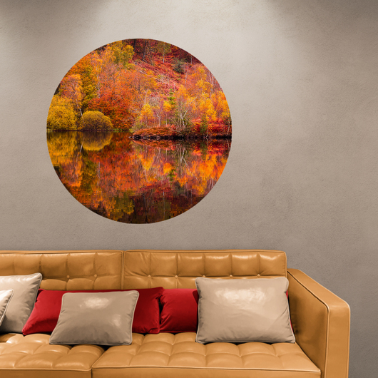 Laat je meeslepen door de schoonheid van de natuur met onze muurcirkel Reflecties van de Herfst. Deze indrukwekkende afbeelding toont het Lake District in volle herfstpracht. De bomen, gehuld in vurige tinten, reflecteren schilderachtig in het kalme water.