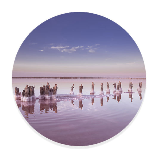 Duik in een schilderachtig landschap met onze muurcirkel Roze Zoutmeer Panorama. De betoverende tinten roze reflecteren de laatste stralen van de zon, creërend een serene en bijna buitenaardse sfeer.