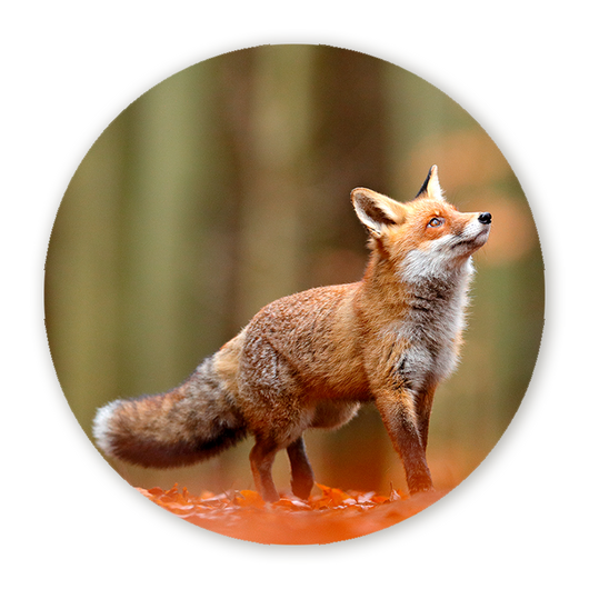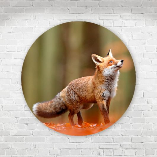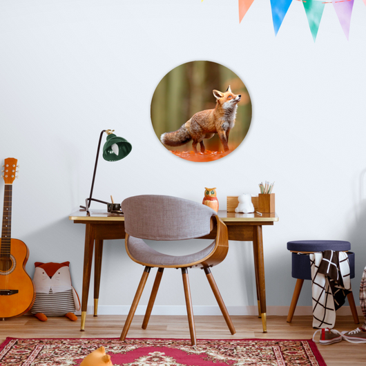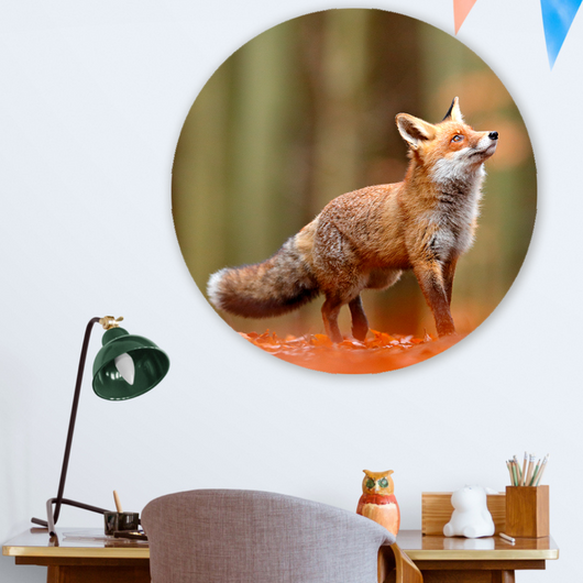 Laat je inspireren door de ongetemde schoonheid van de natuur met onze muurcirkel Vos in het Woud. Deze indrukwekkende weergave toont een rode vos die majestueus door een woud van oranje herfstbladeren loopt.
