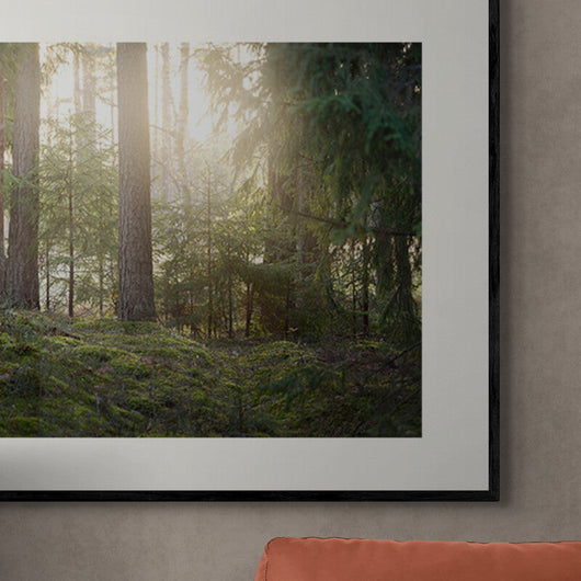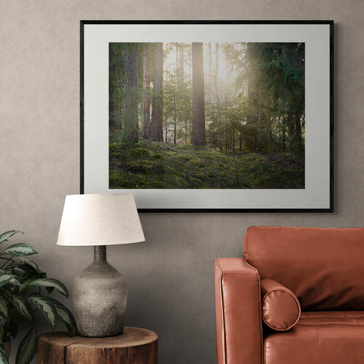 Gevangen in een elegante lijst, nodigt deze afbeelding je uit om te verdwalen in de tijdloze schoonheid van ongerepte wildernis. Hang het op en voel dagelijks de kalmerende invloed van de natuur, direct vanuit het comfort van je eigen huis. Ontdek je eigen ontsnapping met Bosrijke Mysterie.