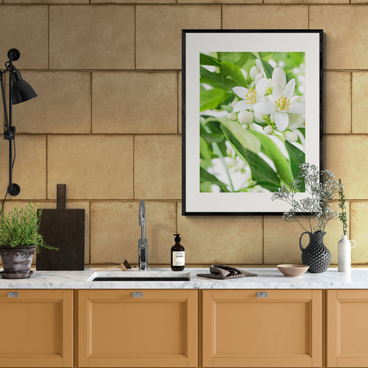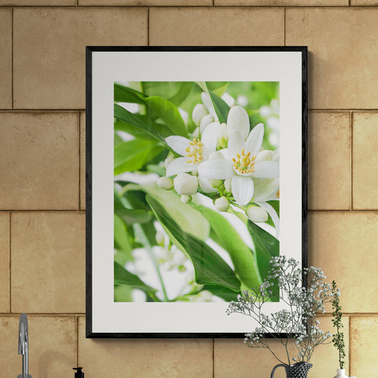Laat je meevoeren door de verfrissende charme van deze poster, Citrusbloesems in volle Pracht, met takken van de sinaasappelboom, rijkelijk versierd met bloesems, knoppen en frisgroene bladeren. De delicate witte nbloemen staan symbool voor vernieuwing en puurheid, terwijl hun zachte geur in veel culturen geassocieerd wordt met vreugde en geluk.
