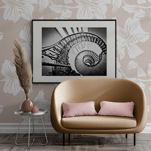 Duik in de tijdloze elegantie van deze ingelijste poster Dans van de Treden, die de majestueuze schoonheid van een klassieke wenteltrap vastlegt. Elk detail van de sierlijke smeedijzeren leuningen en het hypnotiserende spiraalvormige patroon wordt prachtig uitgelicht in scherpe zwart-wit tinten. De subtiele speling van licht en schaduw door de langwerpige ramen voegt een vleugje mysterie toe aan het geheel.