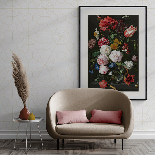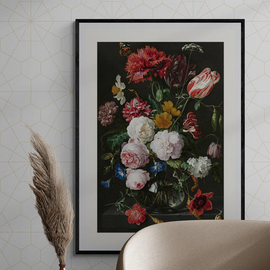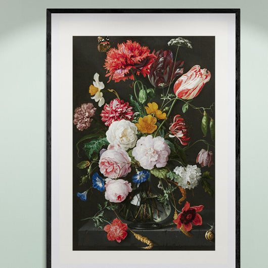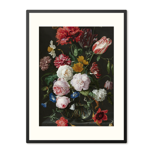 Breng een eeuwige lente in uw leefruimte met deze ingelijste poster van Jan Davidsz. de Heem's beroemde Stilleven met bloemen in een glazen vaas. Elk detail van de Heem's zorgvuldige compositie is gevangen in deze weergave, van de levendige bloesems tot de fijne dauwdruppels die op de bloemblaadjes rusten.