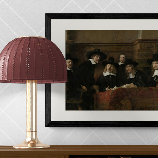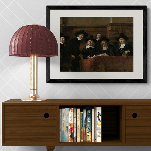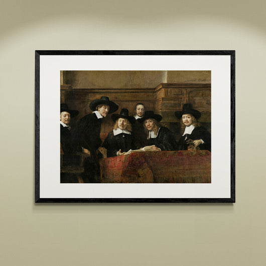 Het groepsportret, vol levendige details, vangt de gildeleden in een onderbroken moment, hun aandacht getrokken door ons, de onzichtbare bezoekers van hun wereld. Deze ingelijste poster is een eerbetoon aan Rembrandt's ongeëvenaarde talent om momenten van alledaagse menselijkheid te transformeren tot eeuwige kunst