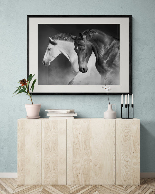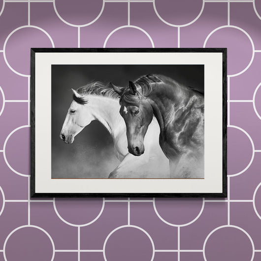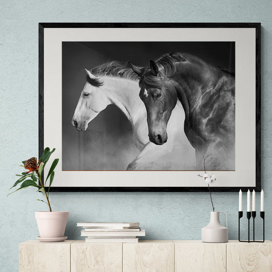 Laat uw ruimte tot leven komen met Galopperende Sierlijkheid, een krachtig zwart-wit beeld dat de pure elegantie en dynamiek van deze nobele dieren vastlegt. Deze poster in lijst biedt een tijdloze blik op twee paarden in perfecte synchronie, waarbij hun verstoorde vacht een visueel verhaal van yin en yang vertelt.