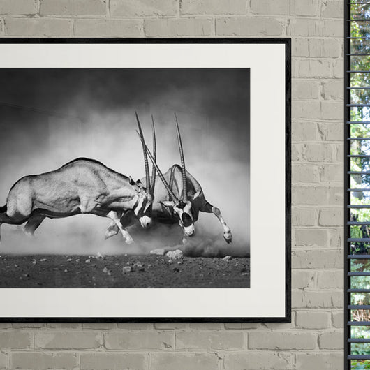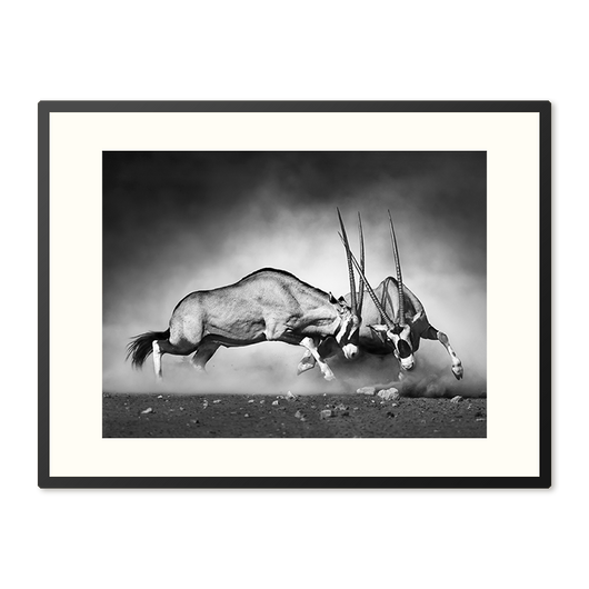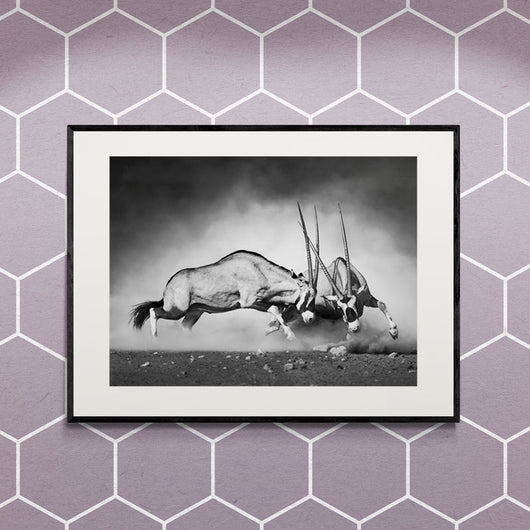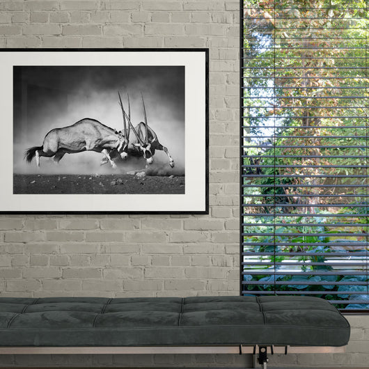 De lijst rondom deze hoogwaardige poster versterkte de intense atmosfeer van het duel. Perfect voor iedereen die een liefde heeft voor wildlife en de natuurlijke schoonheid van de natuur. Gehoornde Rivalen is een kunstwerk dat een onuitwisbare indruk achterlaat en de kracht van het leven viert.