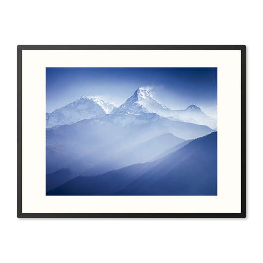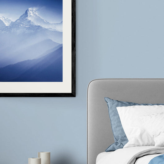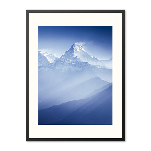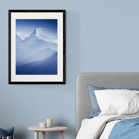 Great Himalayas - een poster in lijst die de grandeur van de natuur in haar puurste vorm vastlegt. Deze foto, waarop besneeuwde bergen zich verheffen boven een zee van nevelige blauwtinten, is een ode aan de tijdloze schoonheid van het hooggebergte. Terwijl het zonlicht de toppen streelt, komt het diepe contrast van wit en blauw tot leven, wat zorgt voor een bijna dromerige uitstraling.