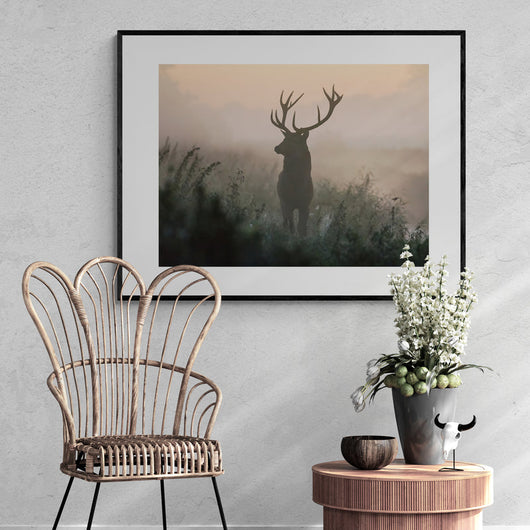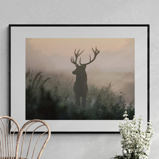 Verrijk je interieur met onze ingelijste poster Hert in de Ochtendmist. Het beeld van een imposant hert, omhuld door de zachte kleuren van de ochtendmist, biedt een unieke mix van natuurlijke schoonheid en artistieke flair.