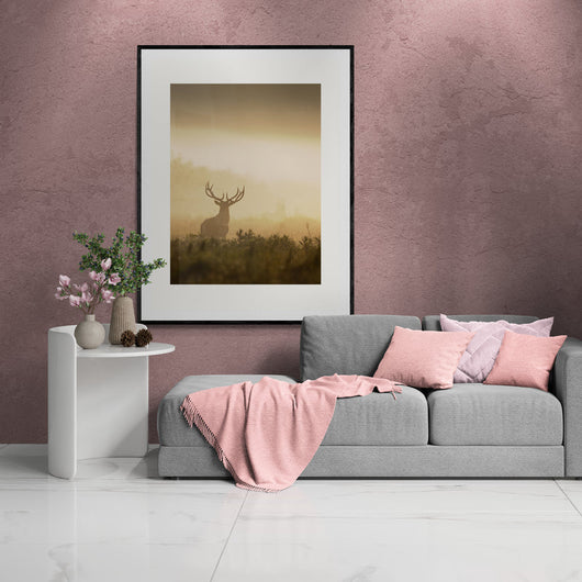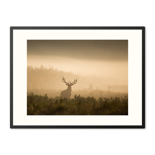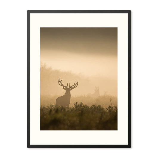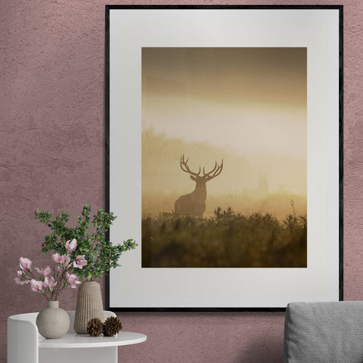 Breng een authentiek stukje natuur in je huis met onze ingelijste poster Hert van het Nevelwoud. De poster toont het silhouet van een hert met imposante geweien, langs de ochtendmist en riet.