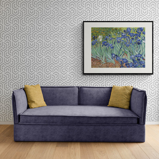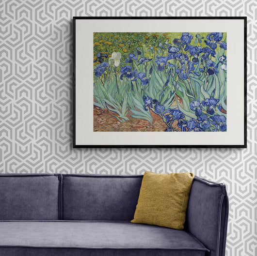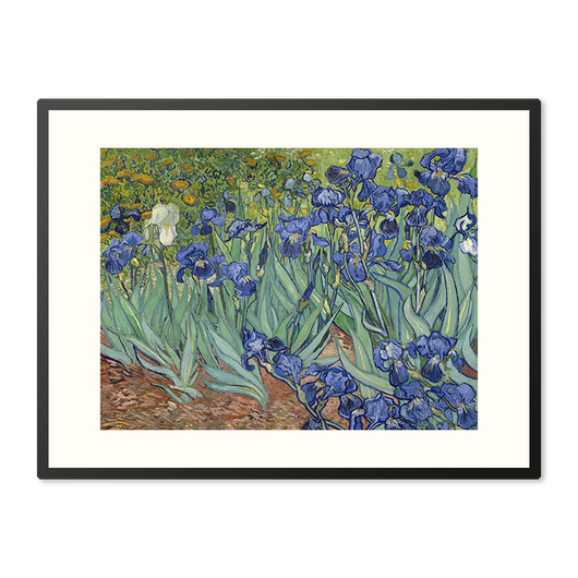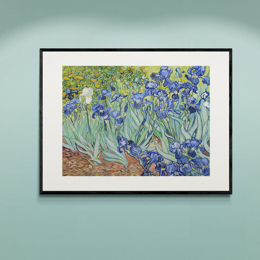 Ervaar de kracht van Van Gogh's kleurenonderzoek met Irissen, een zorgvuldige ingelijste poster die zijn streven naar een schitterend kleurcontrast weergeeft. De transformatie van de irissen van paars naar blauw, veroorzaakt door het vervagen van het rode pigment, vormt een visueel contrast tegen de heldergele achtergrond.