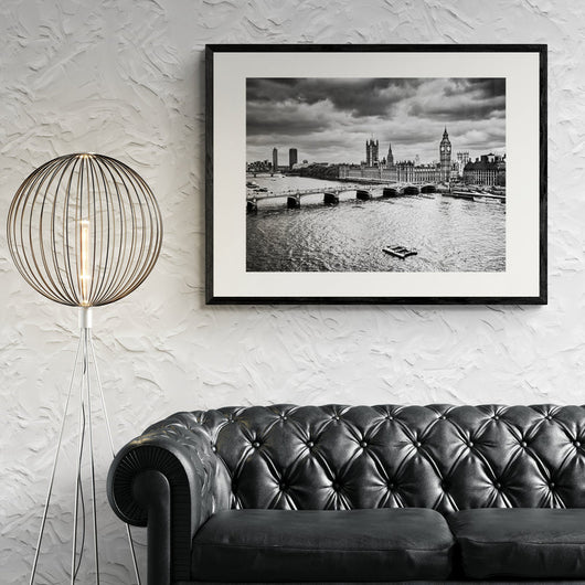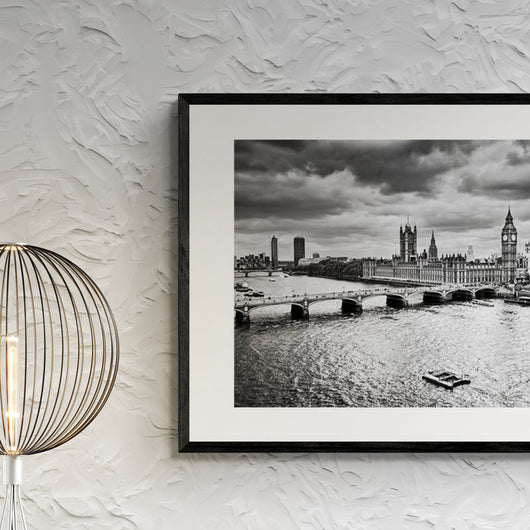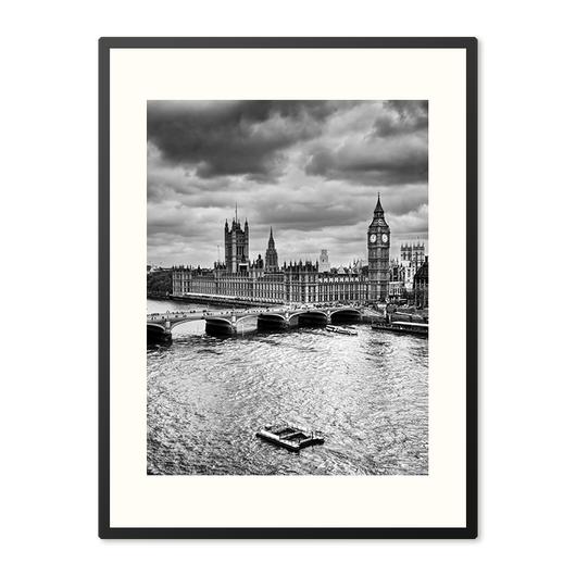 Duik diep in de ziel van Londen met deze verbluffende zwart-wit poster. De iconische Big Ben en het Britse parlement staan centraal, omringd door het bruisende leven van de Theems. Voel de historische charme gemengd met moderne vitaliteit elke keer dat je ernaar kijkt. Gevangen onder dreigende wolken, spreekt deze poster van tijdloze schoonheid en stedelijke grandeur.