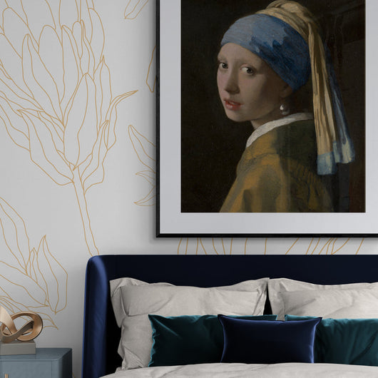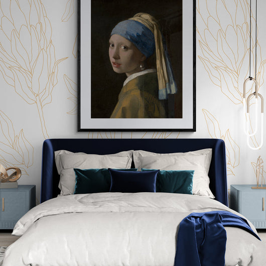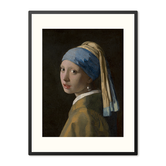 Deze fraai ingelijste poster is een reproductie van het beroemde schilderij Meisje met de Parel van Johannes Vermeer uit circa 1665. Het beeldt een jonge vrouw uit met een betoverende blik en een opvallende kledingstuk, een tulband versierd haar hoofd met een parel in haar oor. De zachte lichtval op haar gezicht, de subtiele tinten en de levendige textuur maken het tot een van Vermeers populairste werken.