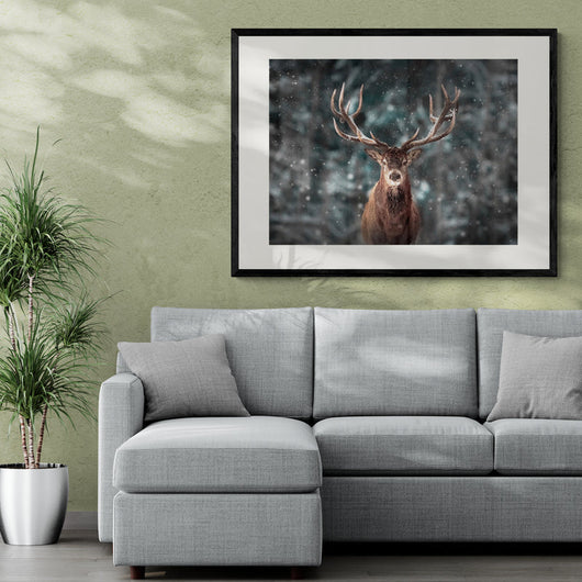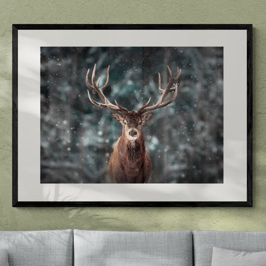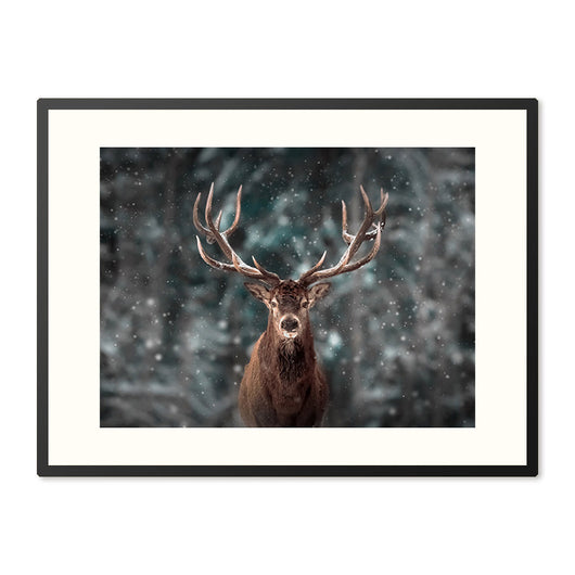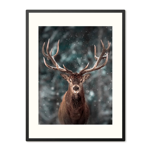 Laat je betoveren door onze ingelijste poster Nobel Edelhert, een artistieke weergave van een majestueus edelhert te midden van een sprookjesachtig winterlandschap. Deze poster brengt je rechtstreeks naar een verstilde winterwereld, waar het edelhert, trots met zijn indrukwekkende gewei, over de sneeuwvlaktes heerst.