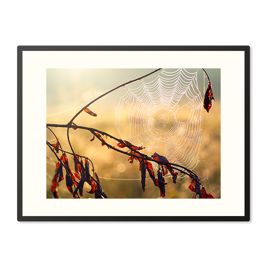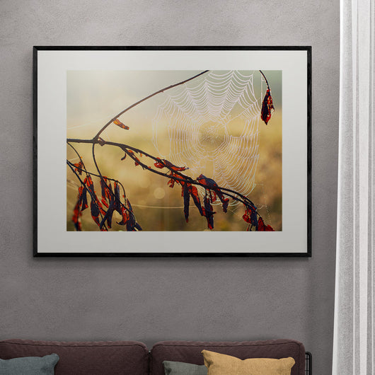 Ontwaak je zintuigen met de serene schoonheid van Ochtenddauw op een Web, een meesterlijke poster in de lijst vangt de essentie van de natuur in één enkel, stil moment. Terwijl de eerste zonnestralen van de hemel strelen, onthult deze betoverende afbeelding een delicaat spinnenweb, bezaaid met dauwdruppels die fonkelen als kristallen aan een ragfijn geweven kroon. De dieprode tinten van de laatste herfstbladeren bieden een warm contrast tegen de zachte gouden gloed van de ochtend.