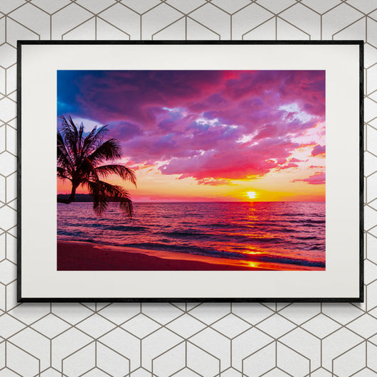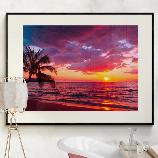 Deze kunstzinnige weergave is niet enkel een decorstuk, maar een venster naar een wereld van sereniteit. Laat de schoonheid van de natuur uw woonruimte verrijken met deze prachtige poster. Perfect voor elke liefhebber van zonsondergangen en tropische gebieden.