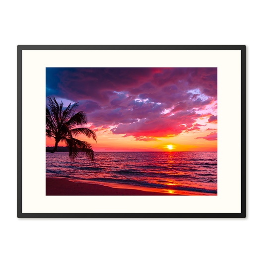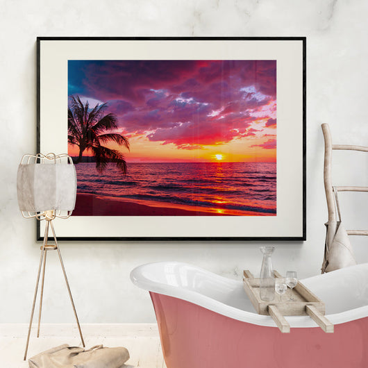 Betover elke dag opnieuw met onze Prachtig Tropisch Strand poster in lijst. Deze adembenemende afbeelding vangt de essentie van een perfecte avond aan het strand, waar levendige kleuren samensmelten in een hemels schouwspel. De majestueuze palmboom op de voorgrond is een exotisch praktische toe, terwijl de zon die aan de horizon langzaam in het water zinkt, de ruimte vult met warmte en roest.