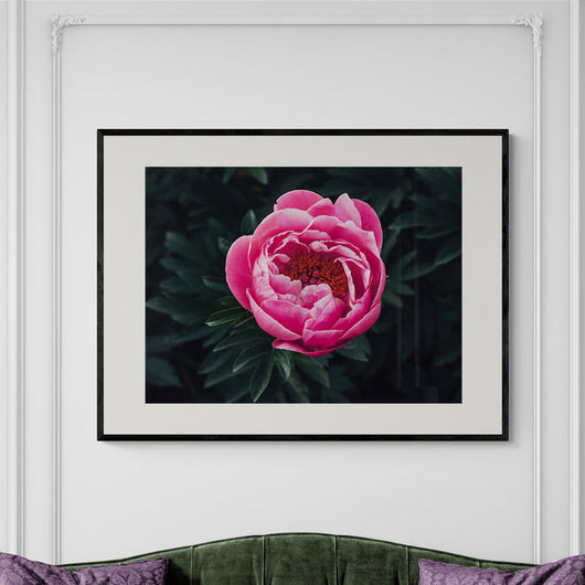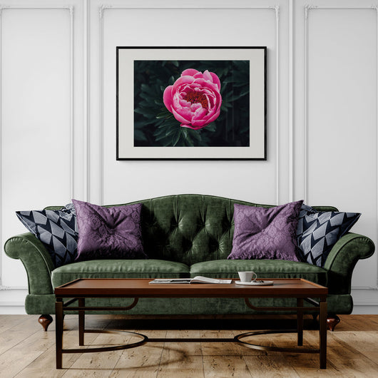 Breng de buitenwereld binnen met onze poster in lijst Prachtige Rose Pioenroos. Deze betoverende poster laat een diep rosé pioenroos zien, prachtig vastgelegd tegen een achtergrond van donkergroene bladeren. Het beeld houdt je aandacht vast en prikkelt je zintuigen prikkelt.