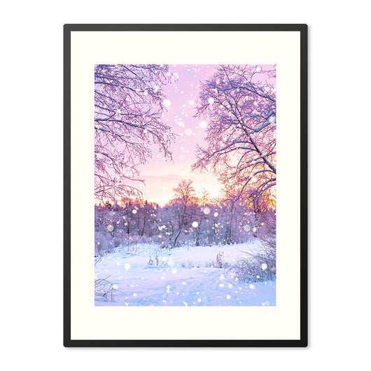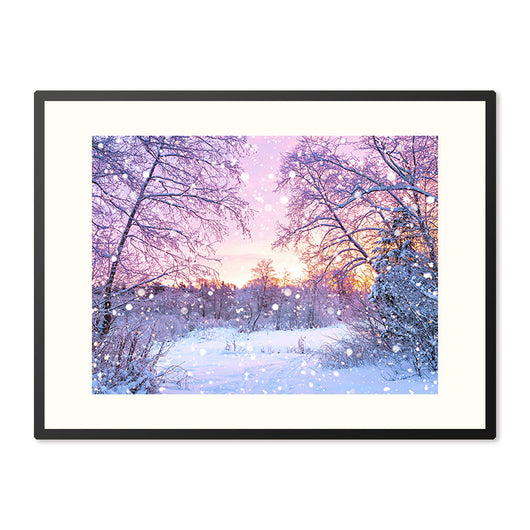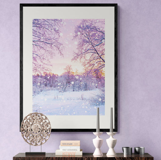 Betreed de serene wereld van onze poster Prachtige Winterochtend . Een tableau dat de zachte overgang van nacht naar dag in een betoverend winterbos vastlegt. Elke tak, elk stukje grond wordt gehuld in een delicate winterdeken, verlicht door de eerste paarse gloed van de zonsopgang.