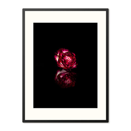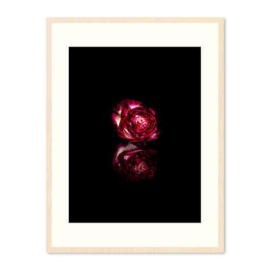 Intens, krachtig en verleidelijk — deze rode roos spreekt de taal van het hart. In het diepste zwart komt de warme gloed van de bloem volledig tot leven, als een symbool van pure passie en tijdloze liefde. De reflectie voegt een dromerig, bijna poëtisch element toe aan de compositie, waardoor het beeld zowel elegant als expressief aanvoelt.