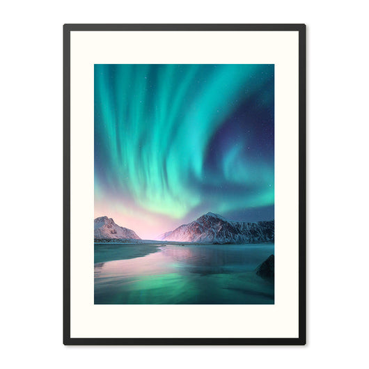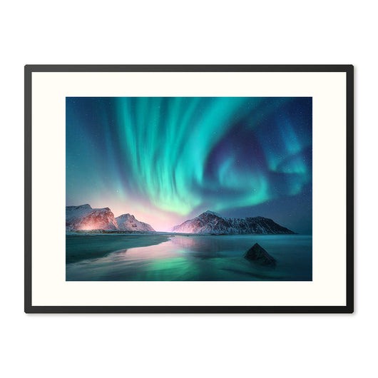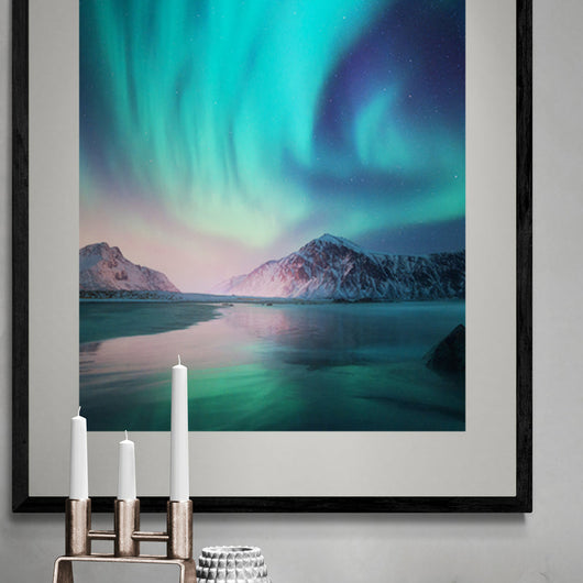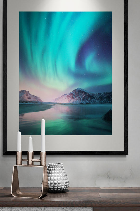 Stel je een wereld voor waar de majestueuze schoonheid van het Noorderlicht elke dag in jouw woonkamer danst. Met onze poster in lijst Sterrenhemel & Noorderlicht wordt dit werkelijkheid. Dit prachtige beeld toont het betoverende Noorderlicht dat speelt boven de glinsterende zee en de besneeuwde bergtoppen van de Lofoten eilanden in Noorwegen.