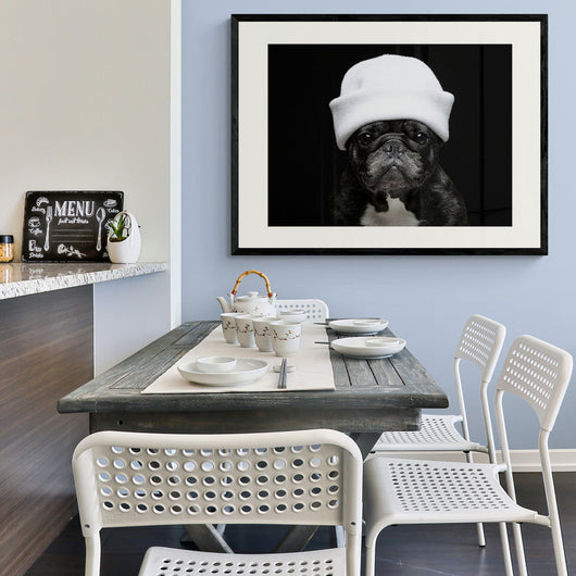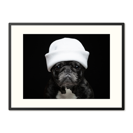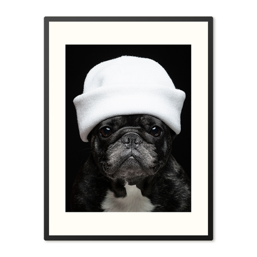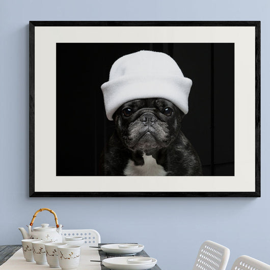 Voeg een verrassende combinatie van stijl en charme toe aan uw interieur met onze Elegante Bulldog poster in lijst. Dit portret van een Franse bulldog, gekroond met een witte muts, is een perfecte aanwinst voor elke hondenliefhebber. De onschuldige ogen vangen uw hart, terwijl de stoere hoofddeksel een unieke draai geeft aan dit huisdierenportret.
