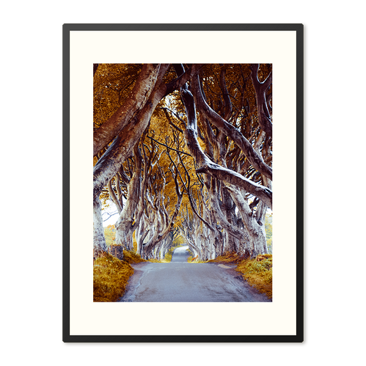 Deze afbeelding brengt de atmosferische schoonheid van County Antrim rechtstreeks in je woonruimte. Ervaar het gevoel van wandelen onder het dichte bladerdak, waar licht en schaduw samenspelen op een eeuwenoud pad.