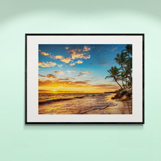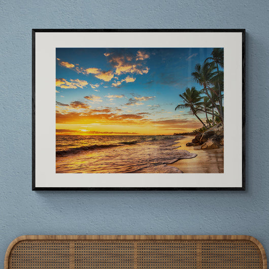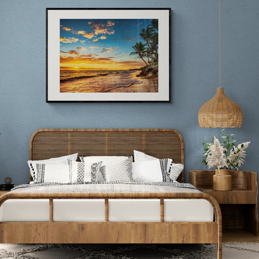 Laat je meevoeren naar een plek waar de tijd stilstaat en de horizon eindeloos lijkt. Met de poster in de lijst Tropisch Paradijs wordt elk moment een uitnodiging om te dromen. Voel de warmte van de gouden zonsondergang, de zachte zeebries die door de palmbomen waait en de rustgevende cadans van kabbelende golven.