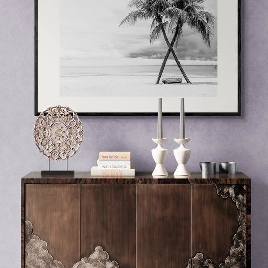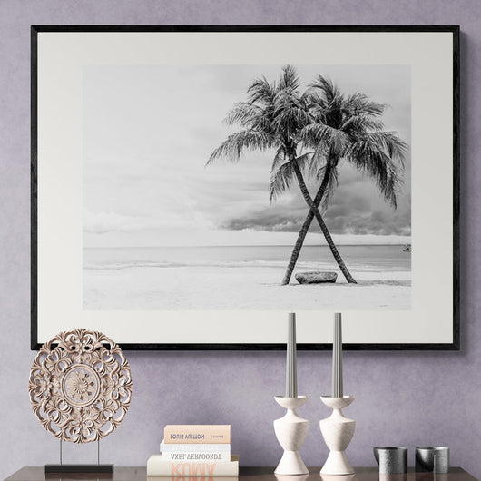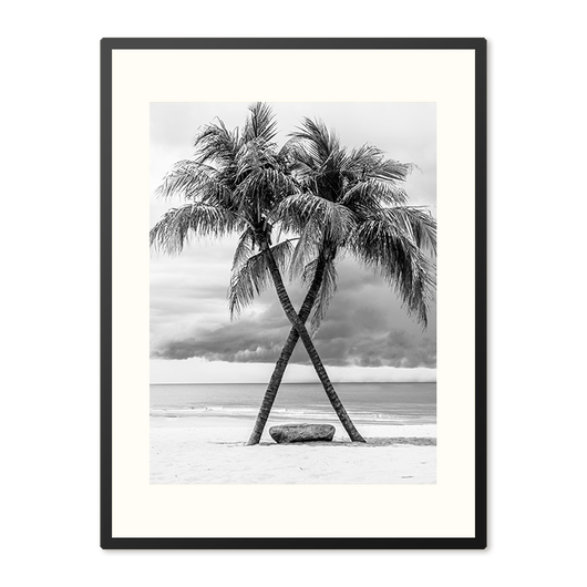 Dompel jezelf onder in de kalme sereniteit van onze Tropische Oase van Rust poster in de lijst. Deze zwart-wit afbeelding van gekruiste kokospalmen tegen een achtergrond van dreigende wolken roept een gevoel van tijdloze schoonheid op. Laat je meeslepen door de zachte zeebries en voel de rust van het verlaten strand, allemaal vanuit het comfort van je eigen huis.