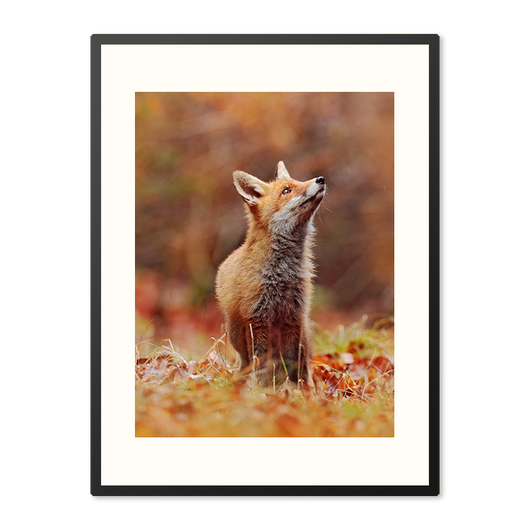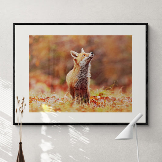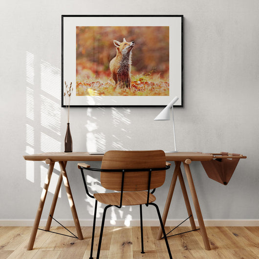 Vos in Herfstlandschap is een ingelijste poster die de essentie van een levendige herfstochtend vastlegt, met een jonge vos die opkijkt naar de vroege zonnestralen. Dit stuk vangt een moment van pure verwondering, waarbij de natuurlijke nieuwsgierigheid van het dier wordt omlijst door de gouden en amberkleurige tinten van de herfst.