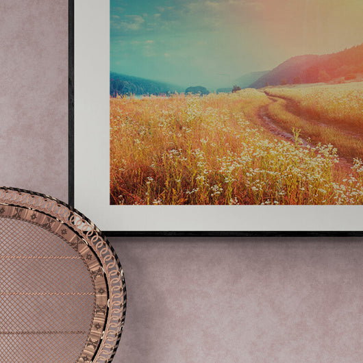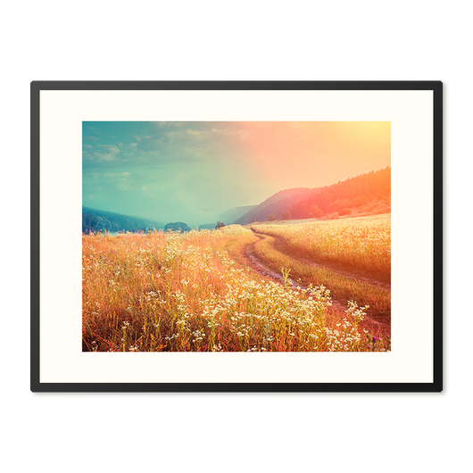 Omlijst in een elegante lijst, biedt deze afbeelding een tijdloos vleugje natuurlijke schoonheid voor je interieur. Een herinnering aan stille momenten en het vinden van schoonheid in het alledaagse. Laat je ruimte stralen met de warmte en sereniteit van de Weidse Zonnegloed.