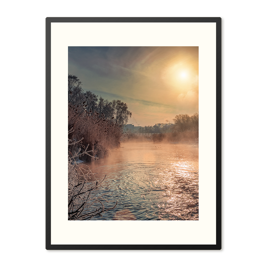 Beleef de rustgevende kracht van de Winterse Ochtendglans elke dag opnieuw. Deze poster toont een adembenemend winterlandschap waar de ochtendzon speels schittert op de golvende rivier, gehuld in een mystieke nevel. Het is een uitnodiging om even stil te staan, diep adem te halen en jezelf te verliezen in het moment.