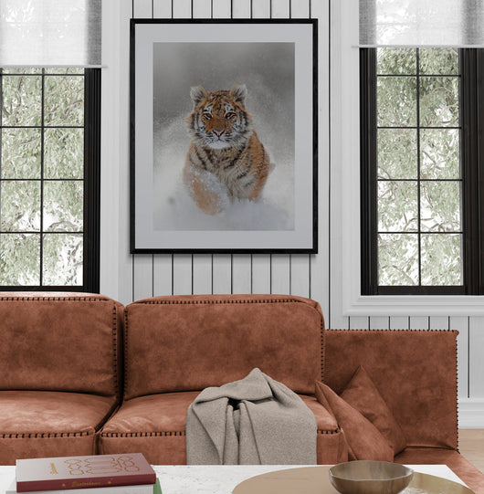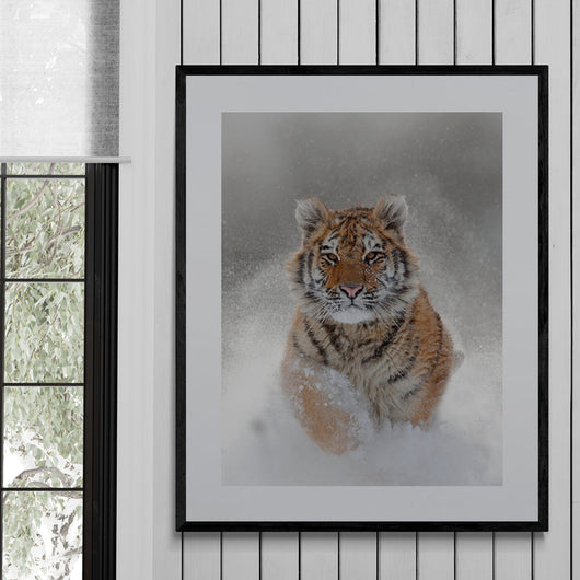 Laat jezelf meevoeren door de rauwe kracht en elegantie van de Siberische tijger met onze exclusieve Winterse Tijger poster in lijst. Dit meesterwerk legt de essentie vast van een tijger, rennend met pure kracht door het ongerepte sneeuwlandschap. Voel de adrenaline en de kou, zie de sneeuwvlokken opspatten met elke stap van dit majestueuze dier.