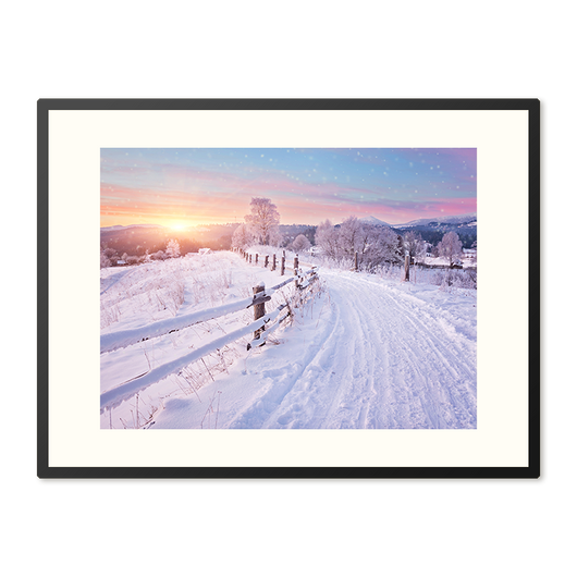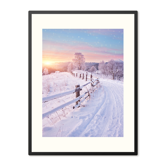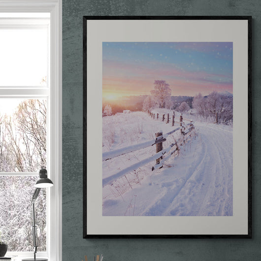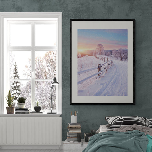 Laat je betoveren door de rust en schoonheid van Winterweg. Dit kunstwerk brengt de serene stilte van een vers besneeuwd landschap recht naar woonkamer. De warme gloed van de zonsopgang vermengt zich met de koude sneeuw en toont een dromerig palet van roze en tinten oranje. Het kronkelende pad nodigt uit tot een wandeling, terwijl de flonkerende sneeuwvlokken je herinnert aan de magie van de winter.