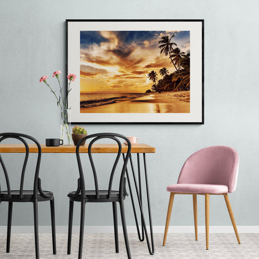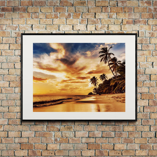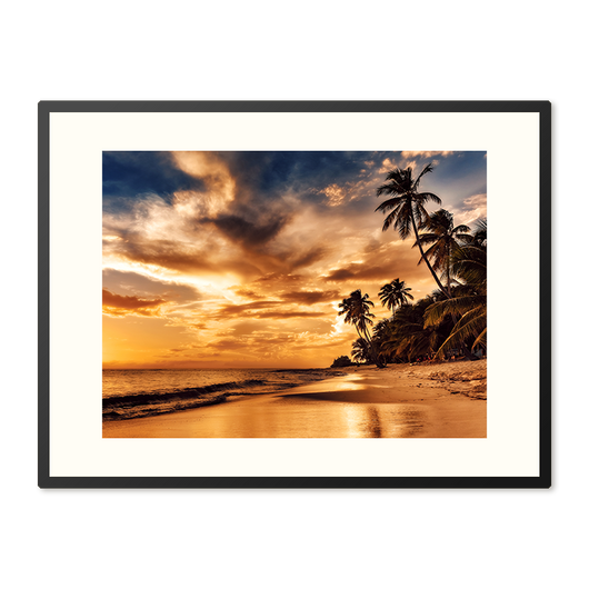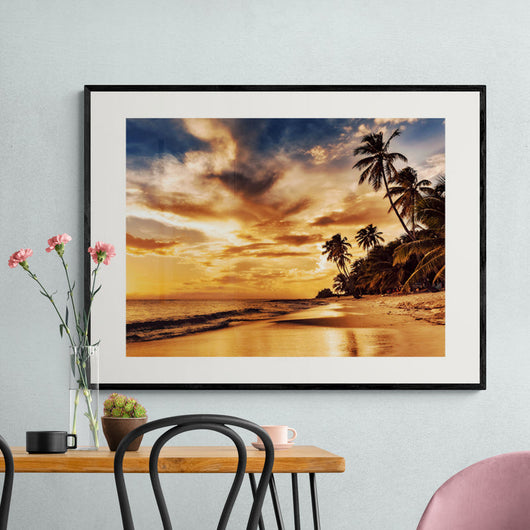 De Zonsondergang op het Strand poster, prachtige ingelijst, is een eerbetoon aan de wonderen van de natuur. De gouden tinten van de zon versmelten met de amberkleurige lucht, waardoor een moment van pure magie wordt vastgelegd. Het silhouet van de palmbomen voegt een exotisch element toe, waardoor je op een afgelegen eiland waant.
