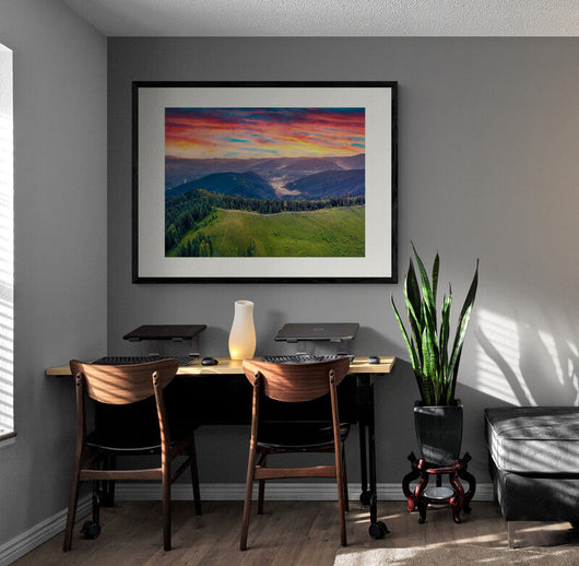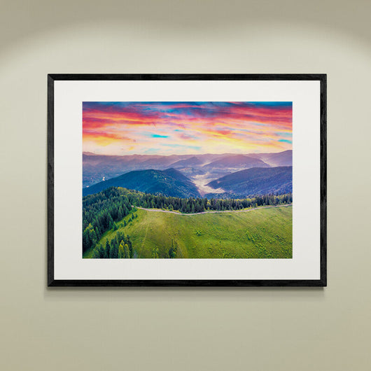 Het zilveren lint van de rivier in de verte voegt een extra vleugje betovering toe. Of je nu een natuurliefhebber bent of gewoon op zoek bent naar een kunstwerk dat een statement maakt, Zonsopkomst in Karpaten is de perfecte keuze. Laat je elke dag inspireren door de wonderen van de natuur, prachtig ingekaderd voor jouw gemak. Een must-have voor elke moderne woonruimte.