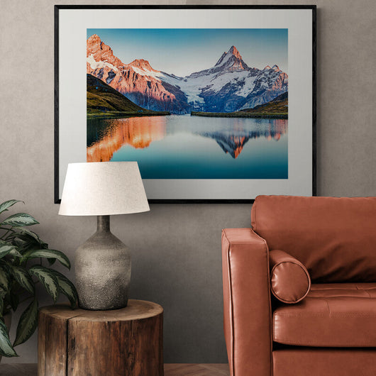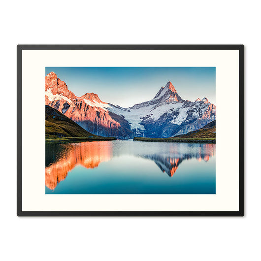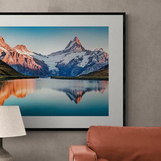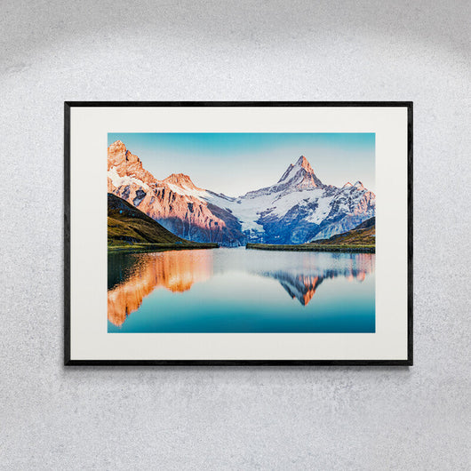 Droom weg in de serene schoonheid van het Bachalp-meer, een verborgen juweel in het hart van Zwitserland. Deze poster, Zwitserse Avonddroom, ingekaderd met een verfijnde lijst, transporteert je naar een avond waar de hemel samensmelt met het kristalheldere water, en het gouden uur de omringende bergen omhult.