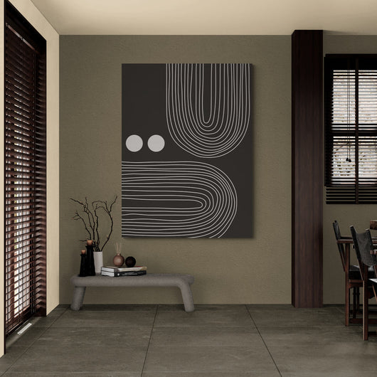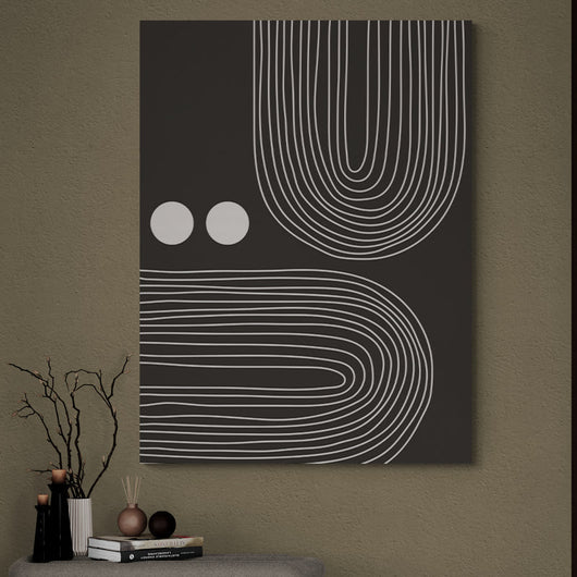 Verrijk je huis met de vloeiende lijnen en kalmerende esthetiek van ons Golvende Harmonie schilderij. Dit kunststuk brengt de essentie van beweging en rust samen op het canvas, met een serie van zwarte lijnen die zachtjes door de ruimte lijken te zweven. De eenvoud van de vormen en de monochrome tinten bieden een rustgevende ervaring, perfect voor het creëren van een ontspannen sfeer in elke kamer.