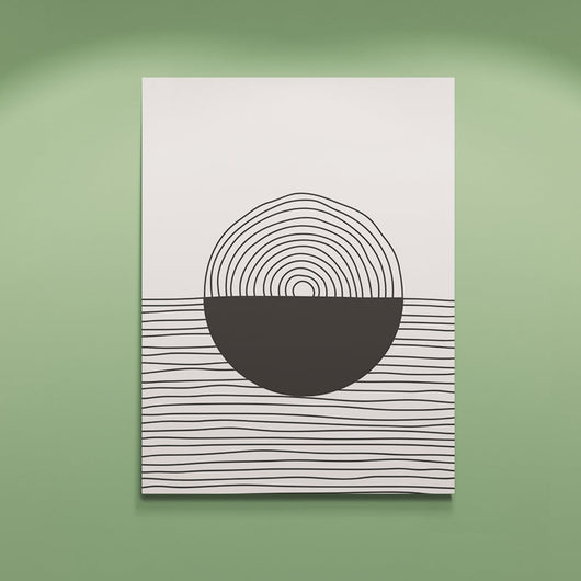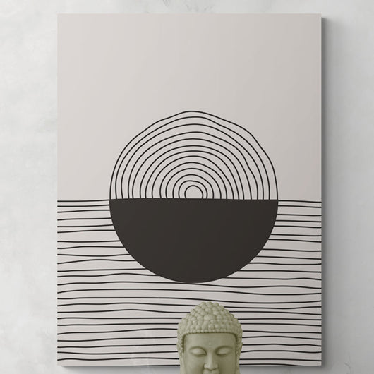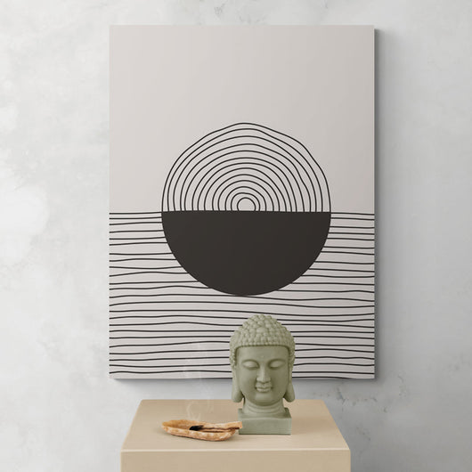 De esthetische balans tussen de cirkels en horizontale lijnen creëert een gevoel van sereniteit, een visueel toevluchtsoord van de buitenwereld. De contrasterende zwarte halve cirkel tegen de neutrale achtergrond staat symbool voor de harmonie tussen tegenstellingen: dag en nacht, licht en donker, energie en rust.