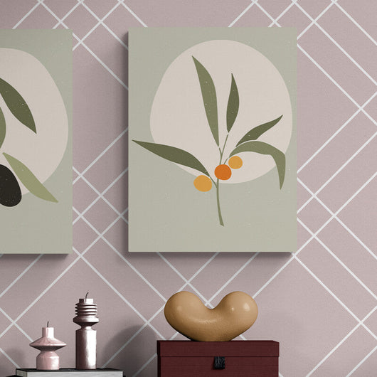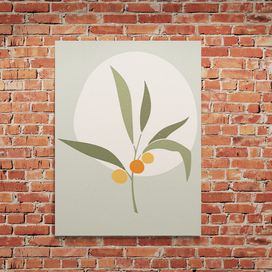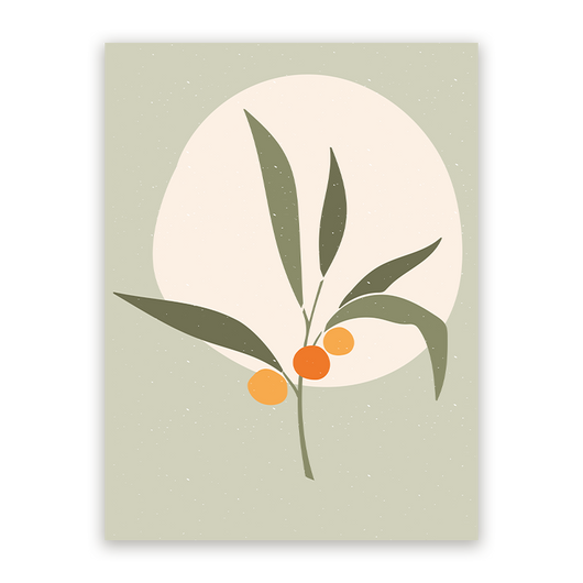 Dit schilderij, Abstracte Tak met Bessen, toont de sereenheid die de natuur ons biedt. De voorstelling van een olijftak met sappige, oranje bessen staat symbool voor groei en vruchtbaarheid, terwijl de cirkelvormige achtergrond van een zachte zon de scène in een kalme gloed zet. De grove korrelige textuur op de lichtgroene achtergrond brengt een extra dimensie van diepte en rust.