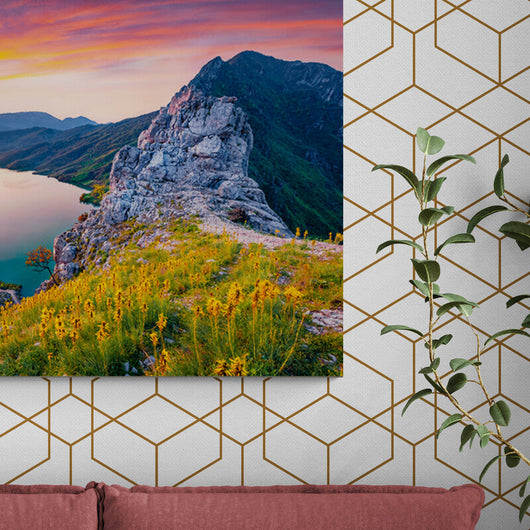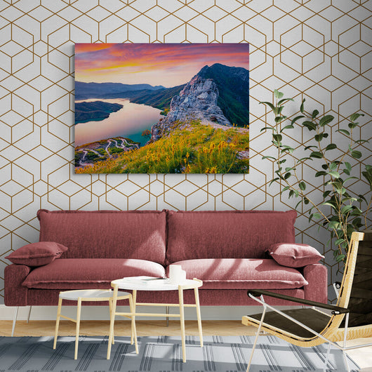 Ontdek de kracht van Bergen bij Dageraad elke dag opnieuw met dit schilderij. De bergen ontwaken uit hun nachtelijke sluimer terwijl de eerste zonnestralen hun toppen raken, waardoor alles in een zacht licht baadt.
