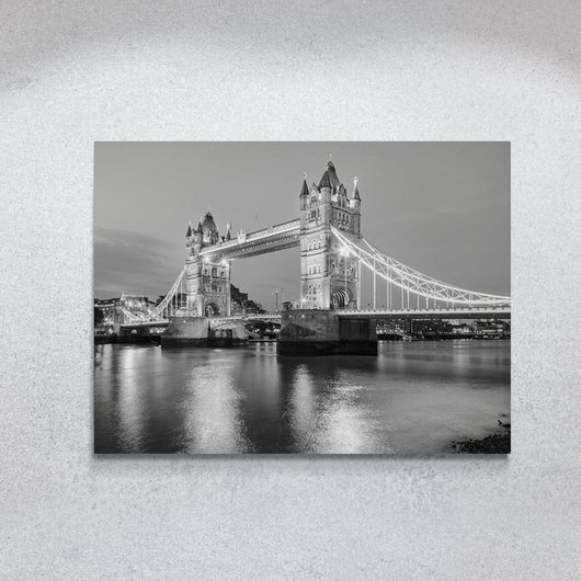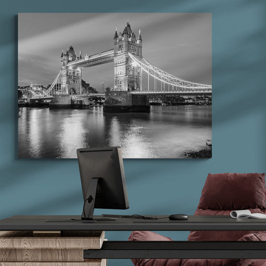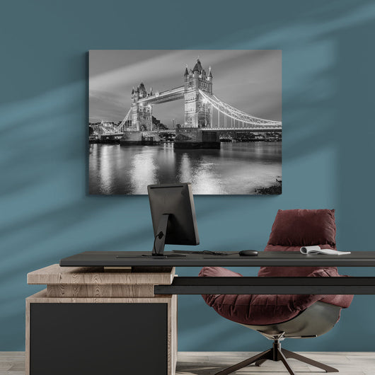 Laat je meevoeren naar het hart van Londen met dit schilderij van Betoverend Licht op Tower Bridge. De details en nuances, vastgelegd in dit zwart-witte kunstwerk, roepen het dynamische ritme en de eeuwige elegantie van de stad op. De brug, schijnend in avondlicht, verbindt heden met verleden en straalt een tijdloze charme uit.