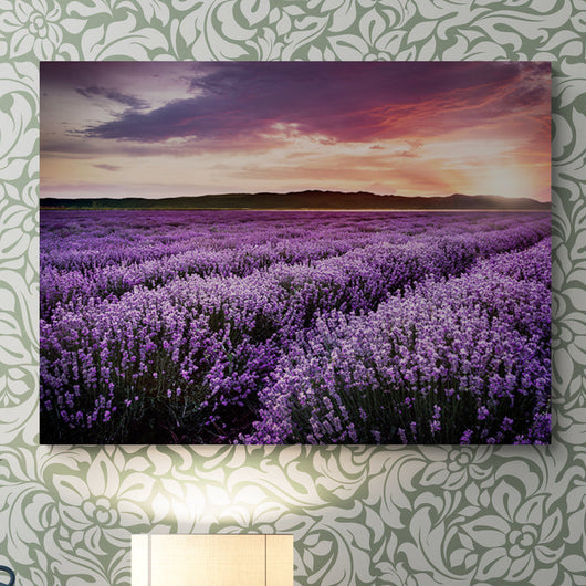 Betreed de betoverende wereld van onze prachtige afbeelding Bloeiend Lavendelveld. Deze schitterende afbeelding neemt je mee naar een veld vol met geurige lavendel, prachtig verlicht door de warme tinten van een zomerzonsondergang. Het paarse schouwspel van de lavendel contrasteert perfect met de gloed van de ondergaande zon, waardoor een schilderachtig en rustgevend landschap ontstaat.